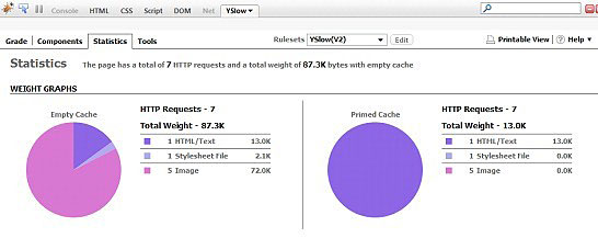 如图:图中的YSlow Statistics,对空缓存的访问用户和之前访问过页面的用户的页面大小做了对比。