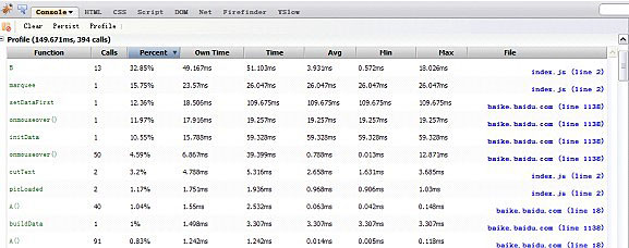 对于某个特定的函数,使用Profiler。JavaScript Profiler是能用来测量每个JavaScript代码执行时间的Firebug特性。使用JavaScript Profiler来提升代码的性能,或是查看为什么某个函数运行时间过长。它与console.time();类似,但JavaScript Profiler能提供更多代码内部过程细节。