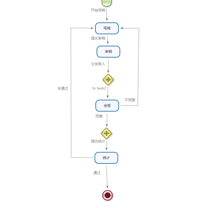 <?xml version="1.0" encoding="UTF-8"?><process key="counterSign" name="会签" xmlns="http://jbpm.org/4.4/jpdl"> <start g="338,-19,48,48" name="start1"> <transition g="-52,-22" name="开始写稿" to="写稿"/> </start> <task assignee="#{sponsor}" g="317,70,92,52" name="写稿"> <transition g="-56,-14" name="提交审稿" to="审稿"/> </task> <task assignee="#{approver}" g="322,149,92,52" name="审稿"> <transition g="-58,-15" name="分发各人" to="foreach1"/> </task> <foreach g="343,246,48,48" in="#{executors}" name="foreach1" var="executor"> <transition g="-52,-22" name="to task2" to="会签"/> </foreach> <task assignee="#{executor}" g="318,332,92,52" name="会签"> <transition g="-38,-21" name="同意" to="join1"/> <transition g="467,357;471,95:-46,104" name="不同意" to="写稿"/> </task> <join g="337,428,48,48" multiplicity="#{quorum}" name="join1"> <transition g="-52,-22" name="提交统计" to="统计"/> </join> <task assignee="#{manager}" g="315,509,92,52" name="统计"> <transition name="通过" to="结束" g="-45,-22"/> <transition name="未通过" to="写稿" g="241,533;240,94:-45,-22"/> </task> <end g="341,638,48,48" name="结束"/> </process>