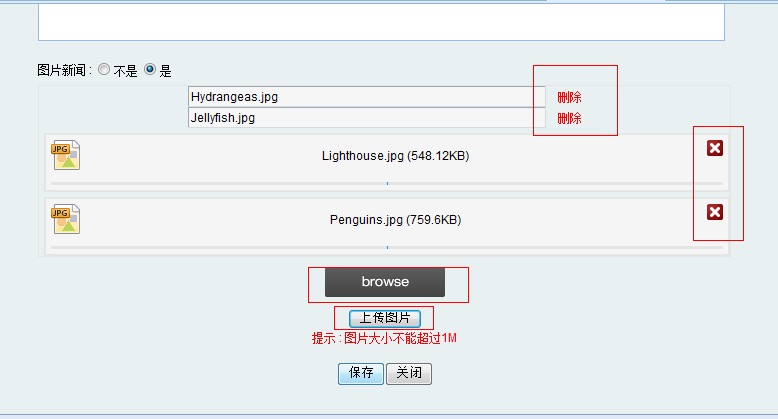 $(document).ready(function(){//设置Flash上传图片的$("#uploadify").uploadify({'uploader':'${ctx}/scripts/dwz/uploadify/scripts/uploadify.swf','script':'${ctx}/fileupload/doUpload.json','cancelImg':'${ctx}/scripts/dwz/uploadify/cancel.png','folder':'/uploadFiles','queueID':'fileQueue','auto':false,'multi':true,'fileExt':'*.jpg;*.gif;*.png;*.JGP;*.GIF;*.PNG','fileDesc':'所有*.jpg;*.gif;*.png文件','buttonText':'browse','displayData':'percentage','onComplete':function(event,queueId,fileObj,response,data){var temp = eval("("+response+")");var tpxwTem = $("#tpxw").val();//显示上传完成的图片$("#fileQueue").append('<div name="picDiv" id="'+queueId+'" name="tpxw" value="'+temp.successFileName+'"><input type="text" name="ymc" value="'+fileObj.name+'"/><span style="cursor: pointer;"> <font color="red">删除</font></span><br/></div>');$("input[name='ymc']").attr("readonly","readonly").attr("size","65").attr("class","textInput readonly");}});//给每个上传完成的图片 添加删除事件$("div[name='picDiv'] span").live("click",function(){deleteUploadFile($(this).parent().attr("id"),$(this).parent().attr("class"));});//处理上传图片$("#doUploadButton").bind("click",function(){$('#uploadify').uploadifyUpload();})});//点击删除上传成功的图片function deleteUploadFile(t_queueID,fileName){var parameters = new Object();parameters["filePath"]=fileName;parameters["divId"]=t_queueID;parameters["fileFolder"]="uploadFiles";$.post("${ctx}/fileupload/deleteFile.json",parameters,function(data){if(data["message"]=='success'){var tempid=data["divId"];$("#"+tempid).remove();}},"json");}<tr><td colspan="3"><center><div id="showMessDiv"></div><p id="uploadInfoWhenComplete" style="line-height:15px;color:#bd0a01;display:none;font-size:12px;"></p><div id="fileUploadDiv" style="display: none;"><div id="fileQueue" id="uploadify" name="uploadify" /><p><br><button id="doUploadButton" onclick="return false;">上传图片</button></p></div></center></td></tr><tr id="uploadMessageTr" style="display: none;"><td colspan="3"><center><font color="red">提示 : 图片大小不能超过1M</font></center></td></tr><tr><td colspan="3"> </td></tr><tr><td colspan="3"><center><input type="submit" onclick="return checkSubmit();" value="保存"><input type="button" value="关闭"></center></td></tr>