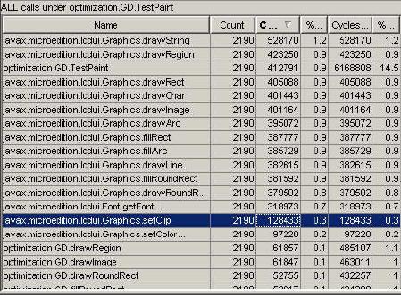 根据Profiler窗口所显示的数据,我们发现drawString最耗时。其次是drawRegion,所以我们应尽量避免使用drawString函数。