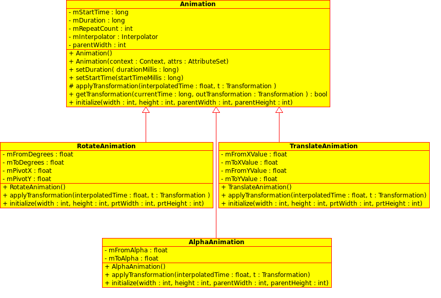 Aniamtion 是基类,他记录了动画的通用属性和方法。主要的属性包括动画持续时间、重复次数、interpolator 等。动画里最重要的方法是 getTransformation (currentTime, outTransformation),该方法根据当前间 (currentTime) 和 interpolator,计算当前的变换,在 outTransformation 中返回。