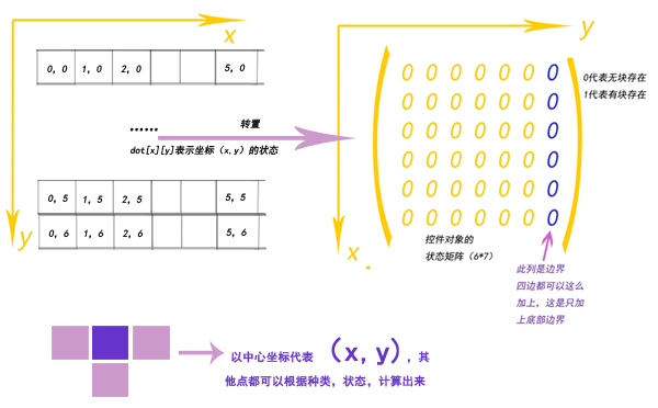 刚开始,方块从上面点出现,(3,0)点就代表其位置,每隔的一定的时间,在检测可以向下移动之后,则中心坐标的纵坐标加1,为(3,1),这样一直往下移,直到判断无法下移了,方块对象的的中心坐标为(x1,y1),将此坐标交给控制对象,由控制对象将自己的状态矩阵相应的四个点置为1,这时,检测消行,之后,让方块的位置坐标重新为(3,0)就行了