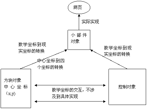 方块的与控制对象的交互只是抽象出来的数学坐标的交互,不涉及实际的坐标,这样,使得理解、操作简单,扩展性强