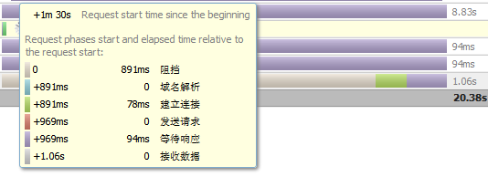 上图是sina微博使用comet实现的长连接方式实现消息推送,1m41s中前面的连接即等待数据的耗时,当微博获取了更新信息的时候就会结束此次连接打开一个新的等待