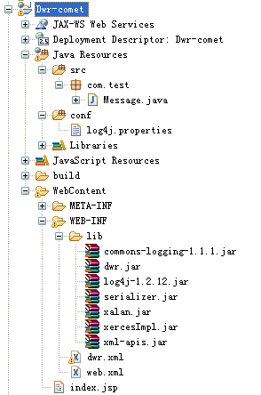 简单的测试类只需要jar文件、一个java消息处理文件、dwr配置文件、web.xml就可以得到一个简单的测试项目