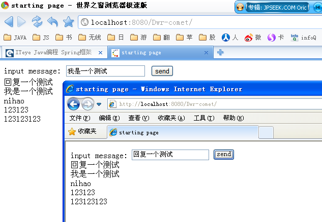 目前为止我仅对DWR简单试验了一下,虽然js的包比较大,不过能够实现即时消息还是值得使用的
