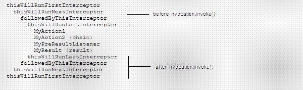 在这里,我稍微改了一下Struts2的Reference中的执行顺序示例,使得整个执行顺序更加能够被理解。我们可以看到,递归调用保证了各种各样的拦截类型的执行能够井井有条。