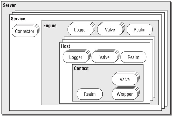 Tomcat里面大概就是这么些东西, 我们可以简单地这么理解tomcat的框架,它是一种自上而下, 容器里又包含子容器的这样一种结构。