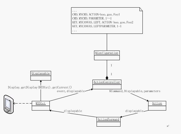 所有的可视组件都位于需要经由MIDlet来显示,而MIDlet上的所有事件,包括键盘事件,按钮事件提交到ActionController上, ActionController跟据配置文件,将事件转发给相应的Action,Action将处理结果得到的可视组件(Displayable)通过 ActionForward返回MIDlet显示。