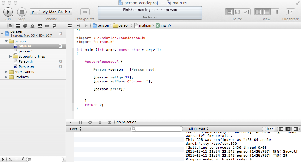 #import <Foundation/Foundation.h>@interface Person : NSObject {// 是不是可以理解为私有变量,成员变量?那本书里没有这个语法。@private NSString *name; int age;}//设置参数方法//变量类型要放在括号里,很奇特的语法- (void) setName:(NSString *) nameValue;- (void) setAge:(int) ageValue;//打印数据- (void) print;@end#import "Person.h"@implementation Person- (void) setName:(NSString *)nameValue{ name = nameValue;}- (void) setAge:(int)ageValue{ age = ageValue;}- (void) print{ // 字符串格式化,nil据说就是0,我也不知道该怎么描述它 // 还要用到stringWithFormat,叫做类方法 NSLog([NSString stringWithFormat:@"姓名:%@",name], nil); NSLog(@"年龄:%d",age);}@end#import <Foundation/Foundation.h>#import "Person.h"int main (int argc, const char * argv[]){ @autoreleasepool { // 实例化Person,这里都是在[]中完成的 // [Person new]意思是向Person发送new指令 Person *person = [Person new]; // 调用setAge方法,冒号后面赋值 [person setAge:29]; // NSString变量初始化时需要用@符号前缀 [person setName:@"Snowolf"]; //调用print方法 [person print]; } return 0;}