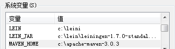 5、安装leiningen(基于maven的一个项目构建工具)。下载leigingen压缩包和独立jar包。解压后全部放在c:\lein目录下。并添加环境变量LEIN和LEIN_JAR,并且添加到path环境变量中。如图: