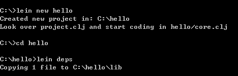 (1)在C:\的命令行运行:lein new hello创建hello项目,运行lein deps下载依赖包。如图: