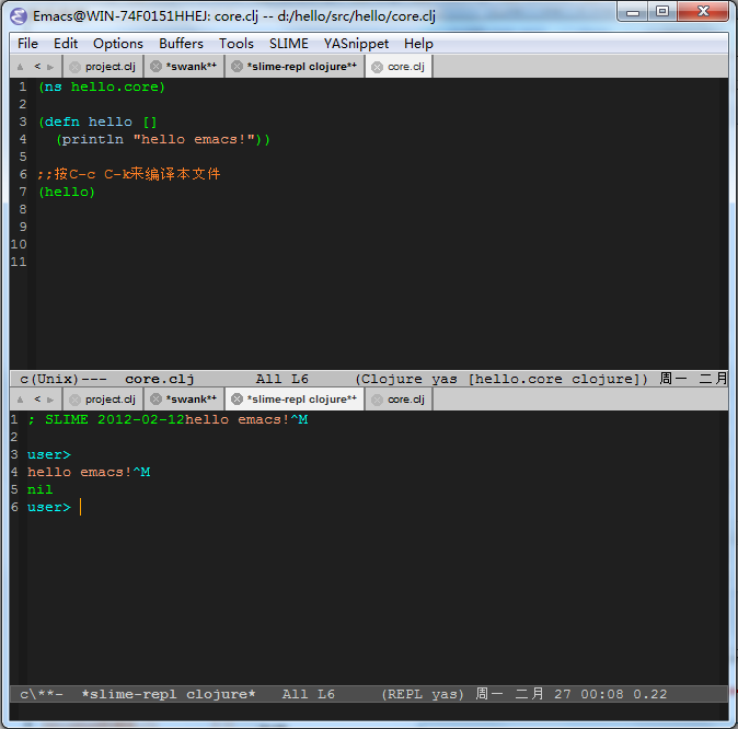 (2)运行Emacs。打开c:\hello目录下的project.clj文件。然后按:Alt-x ,输入:clojure-jack-in。完成启动。进入REPL环境。如图: