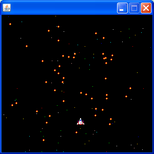import java.awt.Color;import java.awt.Graphics;import java.awt.Image;import java.awt.event.KeyEvent;import java.awt.event.KeyListener;import java.awt.image.BufferStrategy;import javax.swing.ImageIcon;import javax.swing.JFrame;/** * 转载请注明出处 http://mid.iteye.com 2012-01-24 * * @author http://mid.iteye.com * */public class Fly21S extends JFrame implements Runnable, KeyListener {private int isPlaying = 0;private int bg[][] = new int[100][4];// x,y,color,speedprivate int bgMove[] = new int[100];private Color[] colors = new Color[] { Color.BLUE, Color.CYAN, Color.GREEN, Color.ORANGE, Color.RED, Color.WHITE, Color.PINK,Color.YELLOW };private int movePlanDir[] = new int[2];// private long timeOffSet = new Date().getTime();// private long paintBlank = 1;private Image bomb = new ImageIcon("D:\\Java\\eclipse\\workspace\\21sFly\\src\\bomb.gif").getImage();private Image over = new ImageIcon("D:\\Java\\eclipse\\workspace\\21sFly\\src\\over.gif").getImage();private Image[] planImages = new Image[] { new ImageIcon("D:\\Java\\eclipse\\workspace\\21sFly\\src\\plan1.gif").getImage(),new ImageIcon("D:\\Java\\eclipse\\workspace\\21sFly\\src\\plan3.gif").getImage(),new ImageIcon("D:\\Java\\eclipse\\workspace\\21sFly\\src\\plan5.gif").getImage(),new ImageIcon("D:\\Java\\eclipse\\workspace\\21sFly\\src\\crash.gif").getImage() };private int[] planPos = new int[] { 150, 230 };// Plan's current positionprivate double bombPos[][] = new double[50][4];// bomb's position,x direct, y direct.public Fly21S() {setSize(300, 300);setVisible(true);createBufferStrategy(2);setDefaultCloseOperation(JFrame.EXIT_ON_CLOSE);addKeyListener(this);this.setResizable(false);// init bg starfor (int i = 0; i < bg.length; i++) {bg[i] = new int[] { getRandomLessThen(300), getRandomLessThen(300), getRandomLessThen(7), getRandomLessThen(2) + 1 };bgMove[i] = 1;}// init bomb// up and downfor (int i = 0; i < 25; i++) {int xPos = getRandomLessThen(300);int yPos = (int) (getPositiveOrNegative() == -1 ? -1 * getRandomLessThen(50) : (300 + getRandomLessThen(50)));int xDir = 150 - xPos + (getPositiveOrNegative() * getRandomLessThen(2));int yDir = 150 - yPos + (getPositiveOrNegative() * getRandomLessThen(2));bombPos[i] = new double[] { xPos, yPos, xDir, yDir };//}// left rightfor (int i = 0; i < 25; i++) {int xPos = (int) (getPositiveOrNegative() == -1 ? -1 * getRandomLessThen(50) : (300 + getRandomLessThen(50)));int yPos = getRandomLessThen(300);int xDir = 150 - xPos + (getPositiveOrNegative() * getRandomLessThen(2));int yDir = 150 - yPos + (getPositiveOrNegative() * getRandomLessThen(2));bombPos[25 + i] = new double[] { xPos, yPos, xDir, yDir };//}}private int getPositiveOrNegative() {return (Math.round(Math.random()) - 1) == 0 ? 1 : -1;}private int getRandomLessThen(int num) {return (int) Math.round(Math.random() * num);}public void paint(Graphics g) {BufferStrategy bs = this.getBufferStrategy();if (bs == null)return;Graphics tg = bs.getDrawGraphics();tg.fillRect(0, 20, 300, 300);// paint bgfor (int i = 0; i < bg.length; i++) {tg.setColor(colors[bg[i][2]]);tg.drawLine(bg[i][0], bg[i][1], bg[i][0], bg[i][1]);}// paint bombfor (int i = 0; i < bombPos.length; i++) {tg.drawImage(bomb, (int) bombPos[i][0], (int) bombPos[i][1], null);}if (isPlaying == 0) {if (movePlanDir[0] == -1)tg.drawImage(planImages[0], planPos[0], planPos[1], null);else if (movePlanDir[0] == 1)tg.drawImage(planImages[2], planPos[0], planPos[1], null);elsetg.drawImage(planImages[1], planPos[0], planPos[1], null);} else {tg.drawImage(planImages[3], planPos[0], planPos[1], null);tg.drawImage(over, 90, 60, null);// tg.drawChars(new char[] { 'H' }, 0, 1, 150, 150);}this.getBufferStrategy().show();}public static void main(String[] args) {new Thread(new Fly21S()).start();}public void run() {while (isPlaying == 0)try {for (int i = 0; i < bg.length; i++) {if (bgMove[i] % bg[i][3] == 0) {bg[i][1] = bg[i][1] + 1;if (bg[i][1] > 300) {bg[i][0] = (int) Math.round(Math.random() * 300);bg[i][1] = 0;bg[i][2] = (int) Math.round(Math.random() * 7);}bgMove[i] = 1;} else {bgMove[i]++;}}// move bombfor (int i = 0; i < bombPos.length; i++) {double speedXY = Math.sqrt(bombPos[i][2] * bombPos[i][2] + bombPos[i][3] * bombPos[i][3]);double xRate = bombPos[i][2] / speedXY;double yRate = bombPos[i][3] / speedXY;bombPos[i][0] = bombPos[i][0] + xRate * 1.3;// x tobombPos[i][1] = bombPos[i][1] + yRate * 1.3;// y to// new bombif (bombPos[i][1] > 300 || bombPos[i][1] < 0) {int xPos = getRandomLessThen(300);int yPos = (int) (getPositiveOrNegative() == -1 ? -1 * getRandomLessThen(50) : (300 + getRandomLessThen(50)));int xDir = 150 - xPos + (getPositiveOrNegative() * getRandomLessThen(2));int yDir = 150 - yPos + (getPositiveOrNegative() * getRandomLessThen(2));bombPos[i] = new double[] { xPos, yPos, xDir, yDir };//} else if (bombPos[i][0] > 300 || bombPos[i][0] < 0) {int xPos = (int) (getPositiveOrNegative() == -1 ? -1 * getRandomLessThen(50) : (300 + getRandomLessThen(50)));int yPos = getRandomLessThen(300);int xDir = 150 - xPos + (getPositiveOrNegative() * getRandomLessThen(2));int yDir = 150 - yPos + (getPositiveOrNegative() * getRandomLessThen(2));bombPos[i] = new double[] { xPos, yPos, xDir, yDir };//}// check impactif (bombPos[i][0] > planPos[0] && bombPos[i][0] < planPos[0] + 10 && bombPos[i][1] > planPos[1]&& bombPos[i][1] < planPos[1] + 10) {// crashisPlaying = 1;System.out.println("Crash~");}}planPos[0] = planPos[0] + movePlanDir[0];planPos[1] = planPos[1] + movePlanDir[1];repaint();Thread.sleep(33);} catch (InterruptedException e) {}}public void keyPressed(KeyEvent e) {// 38-上 40-下 37-左 39-右// movePlanDir left right up downif ((e.getKeyCode() == 65 || e.getKeyCode() == 37)) {// leftmovePlanDir[0] = -1;} else if ((e.getKeyCode() == 68 || e.getKeyCode() == 39)) {// rightmovePlanDir[0] = 1;} else if ((e.getKeyCode() == 87 || e.getKeyCode() == 38)) {// upmovePlanDir[1] = -1;} else if ((e.getKeyCode() == 83 || e.getKeyCode() == 40)) {//movePlanDir[1] = 1;}repaint();}public void keyReleased(K