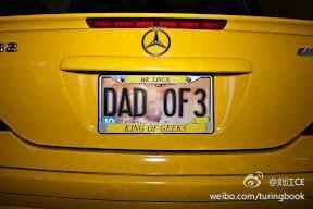 Linux之父Linus Torvalds 的车牌:"DAD OF 3" 三个孩子的父亲。他没有使用和他工作相关的任何东西. 而是说明他第一是个父亲, 而且有3个孩子.