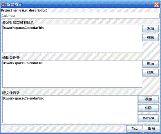 然后添加要分析的类包和目录(可以选择编译好的类所在的文件夹,也可以选择生成的jar包),再添加辅助类所在的文件夹和源文件所在的文件夹(java文件所在的文件夹)。再点击完成就可以建立一个要分析的项目。