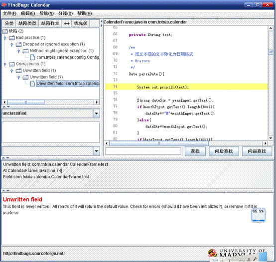 其中左边是缺陷的树结构列表,点击其中一个Bug,可以在右边的界面中,显示Bugs的源文件以及所在的位置。