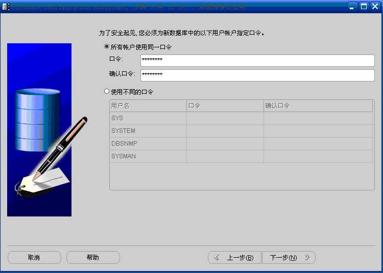 (6)单击“下一步”按钮,出现“数据库身份证明”窗口,选择“所有帐户使用同一口令”,并输入密码:password,如图6: