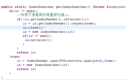 lucene 搜索最新添加索引 在应用中很多时候,我们都是将IndexWriter 和 IndexSearch做成单例模式,这时会出现一种现象:即使IndexWriter.commit(),在IndexSearch查找依然查找不到最新添加的索引,这是因为IndexRead没有重新打开的问题,解决方法(关闭IndexSearch,再重新打开:)