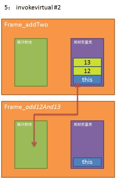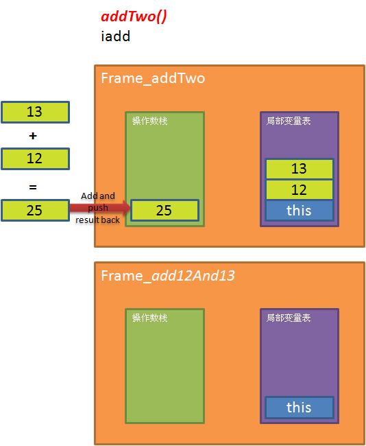 STEP3: 调用addTwo方法,在调用该方法时,JVM创建一个新的frame,并将自己实例的指针,以及参数12和13传给新的Frame中的局部变量表。