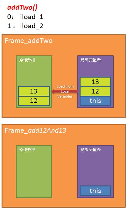 STEP4: 目前的操作都针对Frame_addTwo中的操作数栈,如图,从局部变量表加载位置的变量和位置2的变量,即12和13
