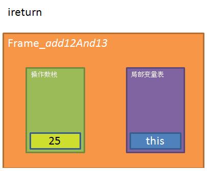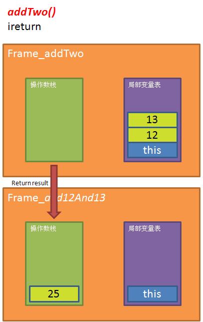 STEP6: addTwo()方法返回,将其栈顶的值(即25)push到其调用者(即add12And13)方法所在的操作数栈,并且在该调用完成后,addTwo所拥有的frame就被删除掉。
