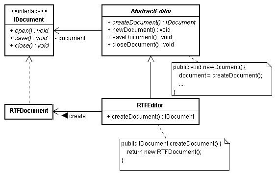 public abstract class AbstractEditor { private IDocument document; public abstract IDocument createDocument(); public void newDocument() { document = createDocument(); document.open(); } public void saveDocument() { if(document != null) document.save(); } public void closeDocument() { if(document != null) document.close(); } } public interface IDocument { public void open(); public void save(); public void close(); } public class RTFEditor extends AbstractEditor { public IDocument createDocument() { return new RTFDocument(); } } public class RTFDocument implements IDocument { public RTFDocument() { System.out.println("建立RTF文件"); } public void open() { System.out.println("开启文件"); } public void save() { System.out.println("储存文件"); } public void close() { System.out.println("关闭文件"); } }