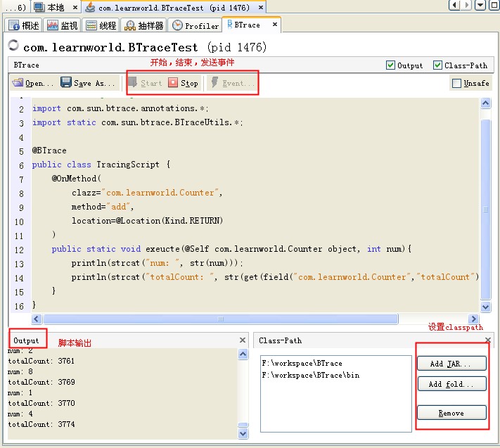 BTrace提供了jvisualvm插件,强烈推荐在jvisualvm中编写和测试BTrace脚本,启动、关闭、发送事件、增加classpath都非常方便。