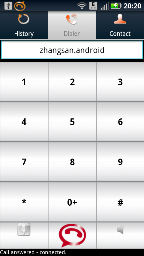 4. 在Linphone的Dialer的输入框中输入另一个SIP帐号, 比如: zhangsan.android@ekiga.net, 点击绿色的拨号按钮, 在另一个手机就会受到来电显示, 点击接收, 通话就可以进行了.