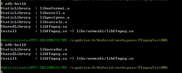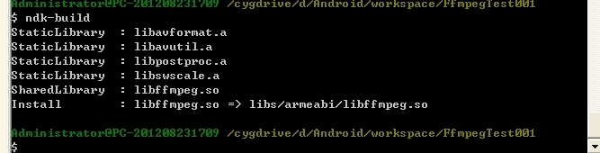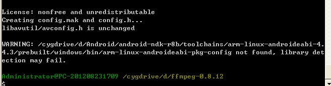 2.还有特别注意的是在命令中例如--cc=/cygdrive/d/Android/android-ndk-r8b/toolchains/arm-linux-androideabi-4.4.3/prebuilt/windows/bin/arm-linux-androideabi-gcc,/cygdrive/d/Android/android-ndk-r8b/toolchains/arm-linux-androideabi-4.4.3/prebuilt/windows不能用$PREBUILT替代,不然找不到文件,具体原因不清楚。(解决昨天的问题)