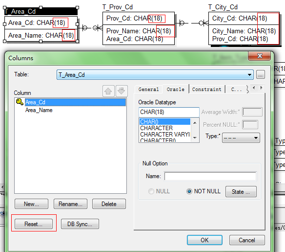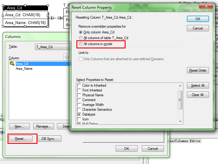 2)点击上图中的Reset按钮,在弹出框中选择“All columns in model”,然后确认(ok)。