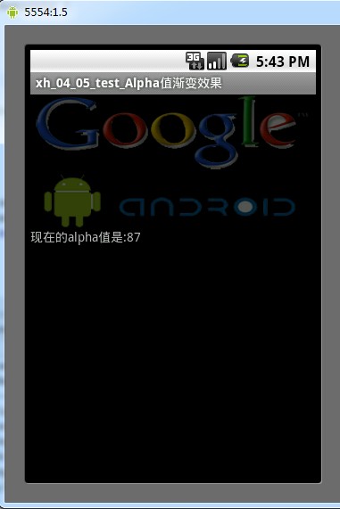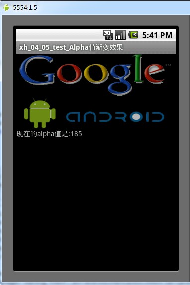 我们要将一个张图片显示在屏幕上,首先需要创建一个显示图片的对象,在Android中,这个对象是ImageView对象,然后通过setImageResources 方法来设置要显示的图片资源索引。当然,还可以对图片执行一些其它的操作,比如设置它的Alpha值等。这里通过一个示例来给大家演示,我们另起一个线程来改变图片的Alpha值。如果大家对线程的交互不熟悉 那推荐大家看这篇文章了 写的很全面了。http://byandby.iteye.com/blog/825071 。我们先看看运行效果吧。