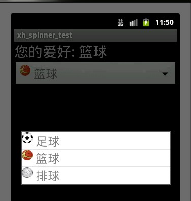 package xiaohang.zhimeng;import android.app.Activity;import android.os.Bundle;import android.view.View;import android.view.ViewGroup;import android.widget.AdapterView;import android.widget.BaseAdapter;import android.widget.ImageView;import android.widget.LinearLayout;import android.widget.Spinner;import android.widget.TextView;import android.widget.AdapterView.OnItemSelectedListener;public class Activity01 extends Activity {final static int WRAP_CONETNT = -2;// 表示WRAP_CONTENT的常量// 所有资源的图片(足球、篮球、排球) id的数组int[] drawableIds = { R.drawable.football, R.drawable.basketball,R.drawable.volleyball };// 所有资源字符串 (足球、篮球、排球) id的数组int[] msgIds = { R.string.zp, R.string.lq, R.string.pq };@Overridepublic void onCreate(Bundle savedInstanceState) {super.onCreate(savedInstanceState);setContentView(R.layout.main);Spinner sp = (Spinner) findViewById(R.id.Spinner01);BaseAdapter ba = new BaseAdapter() {public int getCount() {// 一共三个选项return 3;}public Object getItem(int position) {return null;}public long getItemId(int position) {return 0;}public View getView(int position, View convertView, ViewGroup parent) {// 动态生成每个下拉项对应的View,每个下拉项View由LinearLayout// 中包含一个ImageView及一个TextView构成// 初始化LinearLayoutLinearLayout ll = new LinearLayout(Activity01.this);ll.setOrientation(LinearLayout.HORIZONTAL);// 初始化ImageViewImageView ii = new ImageView(Activity01.this);ii.setImageDrawable((getResources().getDrawable(drawableIds[position])));ll.addView(ii);// 初始化TextViewTextView tv = new TextView(Activity01.this);tv.setText(" " + getResources().getText(msgIds[position]));tv.setTextColor(R.color.black);tv.setTextSize(24);ll.addView(tv);return ll;}};// 为Spinner设置内容适配器sp.setAdapter(ba);sp.setOnItemSelectedListener(new OnItemSelectedListener() {public void onItemSelected(AdapterView<?> parent, View view,int position, long id) {// 获取主界面TextViewTextView tv = (TextView) findViewById(R.id.TextView01);// 获取当前选中选项对应的LinearLayoutLinearLayout ll = (LinearLayout) view;// 获取其中的TextViewTextView tvn = (TextView) ll.getChildAt(1);// 用StringBuilder动态生成信息StringBuilder sb = new StringBuilder();sb.append(getResources().getText(R.string.ys));sb.append(":");sb.append(tvn.getText());// 信息设置进住界面tv.setText(sb.toString());}public void onNothingSelected(AdapterView<?> parent) {}});}}