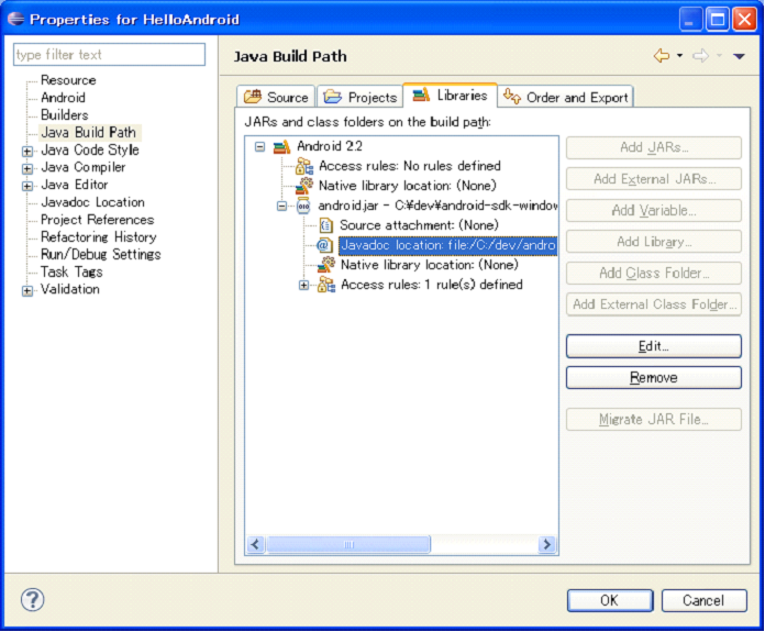 4、依次选择 Java Build Path>Libraries;依次展开 Android 2.2>android.jar;选择 Javadoc location。