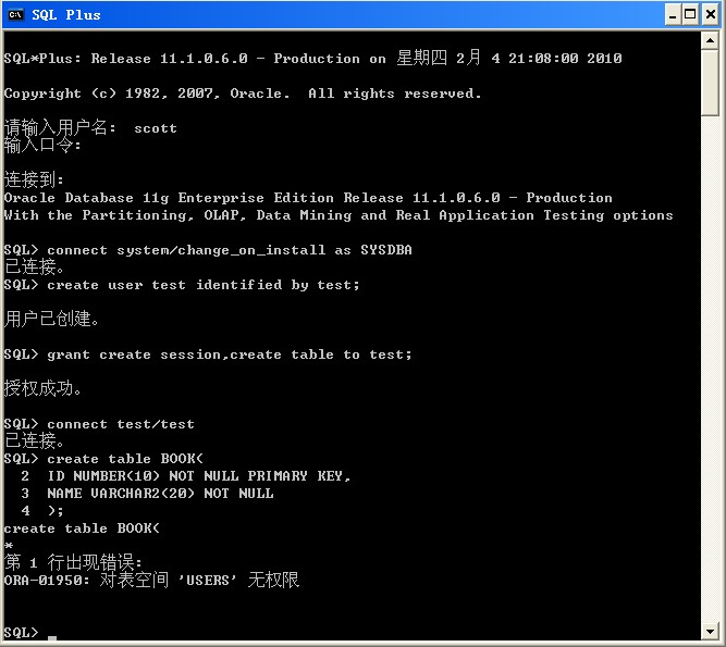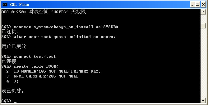 这样就可以创建表了。当然在创建用户的时候就可以避免这个问题,方法也很简单,创建完用户时: create user 用户名 identified by 密码 default tablespace 表空间名;之后再给用户授权: