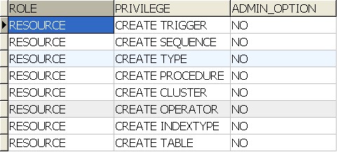 这种方式的授权就是create user时忘记default tablespace也可创建表。connect只有create session权限,这是连接数据库的基本权限。resource是开发者权限,至于其中包含的内容可以查询系统表中的具体内容: