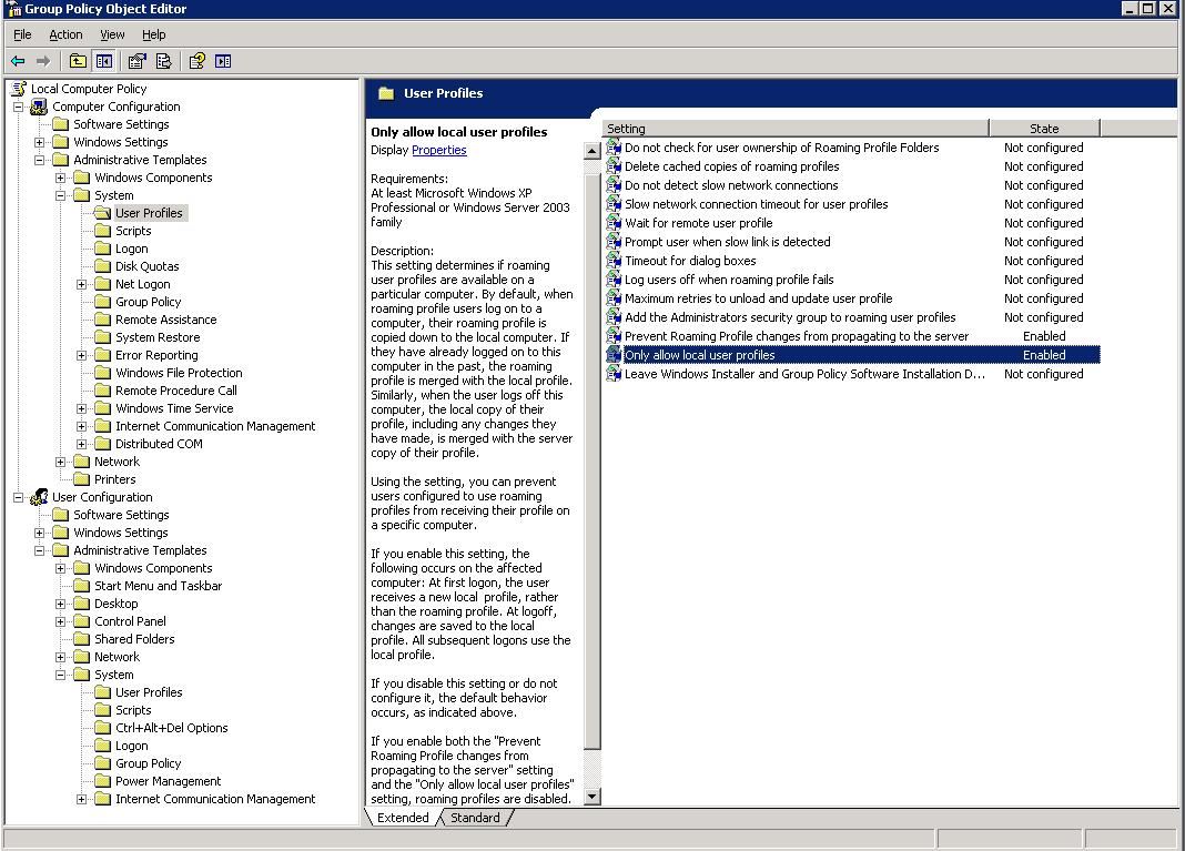2. 然后在里面设置 Computer Configuration\Administrative Templates\System\User Profiles里面的Only allow local user profiles和Prevent Roaming Profile changes from propagating to the server为enabled。