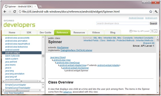 Spinner的重点问题就是下拉列表项的配置,通过之前组件的了解,我们知道资源组件的配置有两种方式,一种是通过XML文件来配置,一种是通过程序来配置。而从Spinner的文档中,我们可以看到,对它的配置需要使用Adapter类的实现。