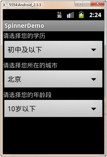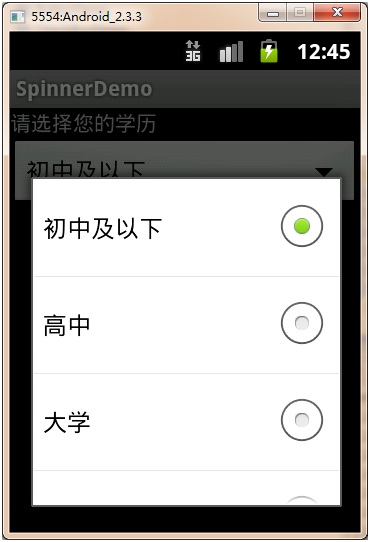 配置Spinner组件中的entries属性即可引用我们在spinner_data.xml中定义的degrees项目组了,不难想到,它已经被注册到R.java中了。运行程序,我们得到如下显示效果: