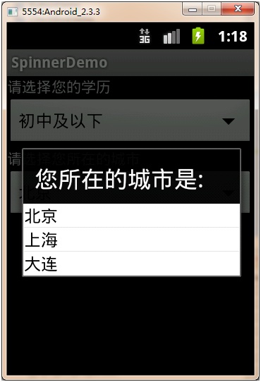 这次再点击Spinner,弹出的下拉框中就有了提示的prompt,显示效果好了很多。