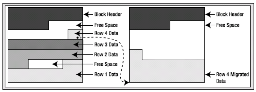 行迁移不能避免,增加每个块的大小可以减少行迁移的可能行,但也会造成更大的空间浪费。这个平衡点需要根据应用不同进行确定。
