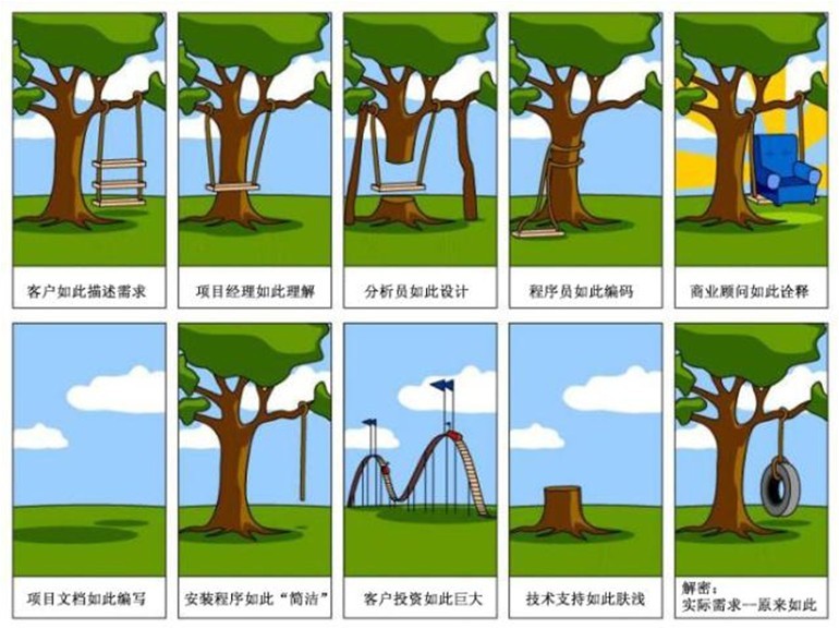 富有深义啊 2 楼 alanleon 2010-06-09 这个图以前也看到过,在参加一个需求分析师培训的时候;我认为主要体现了需求分析的重要性,有时候客户提出的需求并不是他们真正想要的东西,需要与客户沟通,挖掘他们实际的业务信息,然后通过分析,得到他们业务真正的需求。也反映了项目过程中需求跟踪的重要性。