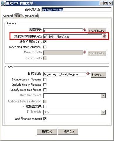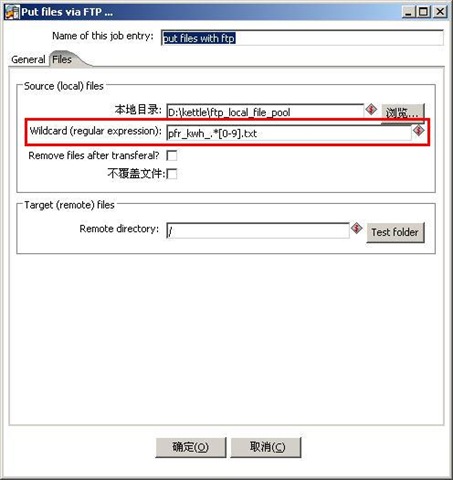 Kettle实践--从FTP上取文件,再放至另一个FTP上 这个实践其实不难,主要是有一个地方要注意,就是文件名通配符的写法,如果文件名格式为“TRANS_yyyymmdd.txt”,如TRANS_20081101.txt。如果想匹配所有以TRANS开头的文本文件,在kettle中要写成这样:TRANS_.*[0-9].txt。最后在windows操作系统中配置定时任务就可以定期执行该Job了。Job的图:FTP配置信息: