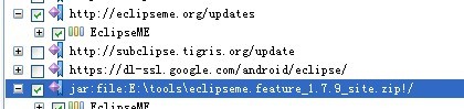 打开Eclipse,依次选择Software Updates,Avilable Software,Add Site,Archie,选择刚才下载的EclipseMe插件,ok,选择刚才加入的插件,如下图: