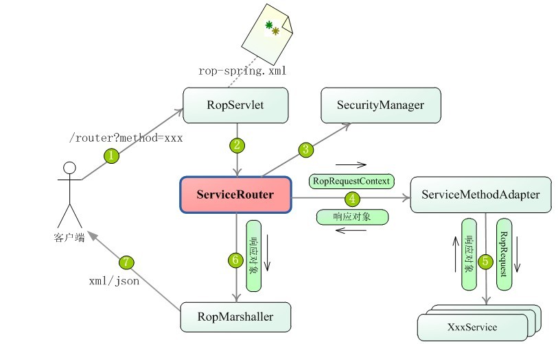 Rop的配置信息统一在Spring配置文件中通过rop Schema命名空间定义。ServiceRouter是Rop框架的核心,它负责协调各组件的交互并最终完成服务处理的工作。RopServlet在启动时会从Spring容器中搜索出ServiceRouter的Bean实例并注册之。