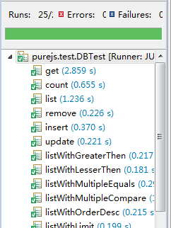 然后下载附件,这是一个 eclipse 工程(就是我们之前一直使用的 PureJS 工程),添加到eclipse中,运行 test/purejs/test/DBTest.java。(鼠标右键 -> Run As -> JUnit Test 或 Alt + Shift + X, T)