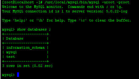 》/usr/local/mysql/bin/mysql -uroot -proot              //进入并访问mysql数据,如果进入mysql数据库命令行,说明mysql数据库安装成功。