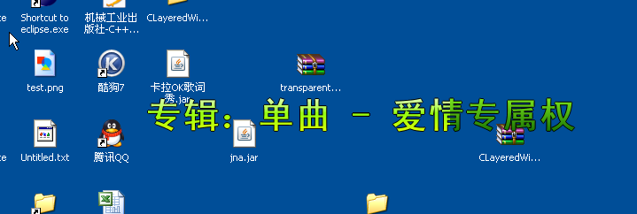 import java.awt.AlphaComposite;import java.awt.Color;import java.awt.Cursor;import java.awt.Font;import java.awt.FontMetrics;import java.awt.GradientPaint;import java.awt.Graphics;import java.awt.Graphics2D;import java.awt.RenderingHints;import java.awt.TexturePaint;import java.awt.event.ActionEvent;import java.awt.event.ActionListener;import java.awt.event.MouseAdapter;import java.awt.event.MouseEvent;import java.awt.event.MouseListener;import java.awt.event.MouseMotionListener;import java.awt.font.FontRenderContext;import java.awt.font.TextLayout;import java.awt.geom.Rectangle2D;import java.awt.geom.RoundRectangle2D;import java.awt.image.BufferedImage;import java.io.File;import java.io.FileReader;import java.io.InputStreamReader;import java.io.LineNumberReader;import java.util.LinkedList;import java.util.List;import javax.swing.*;import com.sun.jna.Native;import com.sun.jna.Pointer;import com.sun.jna.examples.WindowUtils;import com.sun.jna.examples.win32.User32;import com.sun.jna.examples.win32.W32API;import com.sun.jna.ptr.IntByReference;/** * 卡拉OK歌词效果,模仿Kugou桌面上的歌词秀 * @author 李涛 * @version v1.0 2011-09-11 * * 歌词秀有以下细节注意点: * 1、没有“窗口”,直接在桌面上绘制歌词 * 2、歌词文字是彩色的,且颜色渐变。已唱歌词与未唱歌词的渐变色不同。歌词、、文字有黑色边框,以便于周围背景清晰区分 * 3、歌词可拖动,当鼠标移上去时会变成可拖动的形状 * * 用Java实现,有以下技术点: * 1、透明窗口 * 这个需要借助JNA来实现,通过 * System.setProperty("sun.java2d.noddraw", "true"); * WindowUtils.setWindowTransparent(this,true); * 使得窗口透明 * * 2、渐变的彩色文字,使用GradientPaint填充一个BufferedImage,BufferedImage的渐变色即为歌词的渐变色。然后取得歌词的形状, * 用此BufferedImage填充即可。比较麻烦的是文字的黑色边框,这个最后想了一个办法就是分别向上下左右偏移一个像素绘制 * 黑色的歌词,然后在其上绘制正常的彩色渐变歌词,这样最终的叠加相关就正好是我们需要的效果。 */public class LyncWin extends JDialog {/** * */private static final long serialVersionUID = 1L;private JLabel infoLabel;private MyCloseButton closeButton;static List<String> msgList = new LinkedList<String>();public LyncWin(){setTitle("卡拉OK歌词Demo"); setBounds(300, 200, 800, 110); final ContentPane panel = new ContentPane();this.setContentPane(panel);MyMouseListener m = new MyMouseListener(this, panel);panel.addMouseListener(m);panel.addMouseMotionListener(m);getContentPane().setLayout(null); this.getRootPane().setOpaque(false);closeButton = new MyCloseButton(this);closeButton.setOpaque(false);closeButton.setBounds(0, 0, 18, 18); closeButton.addActionListener(new ActionListener(){public void actionPerformed(ActionEvent e) {System.exit(0);}});closeButton.setVisible(false);add(closeButton);setResizable(false);this.setUndecorated(true);setDefaultCloseOperation(WindowConstants.DISPOSE_ON_CLOSE);//com.sun.awt.AWTUtilities.setWindowOpacity(this, 0.93f); //com.sun.awt.AWTUtilities.setWindowShape(this, new Ellipse2D.Double(0, 0, getWidth(),getHeight())); this.setAlwaysOnTop(true); initMsg(); new Timer(30, new ActionListener() { public void actionPerformed(ActionEvent e) { LyncWin.this.repaint();//infoLabel.setText(msgList.get(i++)); } }).start(); panel.addMouseListener(new MouseAdapter(){ @Overridepublic void mouseEntered(MouseEvent e) {closeButton.animateShow();panel.setCursor(Cursor.getPredefinedCursor(Cursor.MOVE_CURSOR));}@Overridepublic void mouseExited(MouseEvent e) {closeButton.animateHide();}}); System.setProperty("sun.java2d.noddraw", "true"); WindowUtils.setWindowTransparent(this,true); this.setVisible(true);}//private void makeWinTransparent() {//Pointer winPointer = Native.getComponentPointer(this);// W32API.HWND hwnd = new W32API.HWND();// hwnd.setPointer(winPointer); // IntByReference color = new IntByReference(this.getBackground().getRGB());// // User32.INSTANCE.SetWindowLong(hwnd, User32.GWL_EXSTYLE, User32.INSTANCE.GetWindowLong(hwnd, User32.GWL_EXSTYLE)|User32.WS_EX_LAYERED);// User32.INSTANCE.SetLayeredWindowAttributes(hwnd, this.getBackground().getRGB(), (byte)220, User32.LWA_COLORKEY);// this.setVisible(false);// this.setVisible(true);//}void initMsg(){try {LineNumberReader lnr = new LineNumberReader(new InputStreamReader(Class.class.getResourceAsStream("/Msg.ini")));while(lnr.ready()){msgList.add(lnr.readLine());}} catch (Exception e) {// TODO Auto-generated catch blocke.printStackTrace();}}class ContentPane extends JPanel{private static final long serialVersionUID = 1L;int i = 0; //哪一行歌曲文字int length = 0; //本行文字的宽度String msg = null;BufferedImage bufferedImage;//已唱文字的渐变色彩private Color gradientStart = new Color(238,254,218);private Color gradientCenter = new Color(153,254,17);private Color gradientEnd = new Color(232,254,3);//未唱文字的渐变色彩private Color gradientEndU = new Color(14,104,0);private Color gradientStartU = new Color(134,242,32);public ContentPane(){setFont(new Font("黑体",Font.BOLD,40));this.setOpaque(false);this.setForeground(this.getBackground());}@Overrideprotected void paintComponent(Graphics g){if(msg ==null){msg = msgList.get(0);}Graphics2D g2 = (Graphics2D)g.create();RenderingHints hints = new RenderingHints(RenderingHints.KEY_ANTIALIASING, RenderingHints.VALUE_ANTIALIAS_ON); hints.put(RenderingHints.KEY_INTERPOLATION, RenderingHints.VALUE_INTERPOLATION_BILINEAR); hints.put(RenderingHints.KEY_RENDERING, RenderingHints.VALUE_RENDER_QUALITY); g2.setRenderingHints(hints); g2.setColor(new Color(0,0,0));g2.setFont(getFont());FontMetrics fm = getFontMetrics(getFont());Rectangle2D rect = fm.getStringBounds(msg, g2);if(length>rect.getWidth()){length = 0;if(i>=msgList.size()){i=0;msg = msgList.get(i++);fm = getFontMetrics(getFont());rect = fm.getStringBounds(msg, g2);}else{msg = msgList