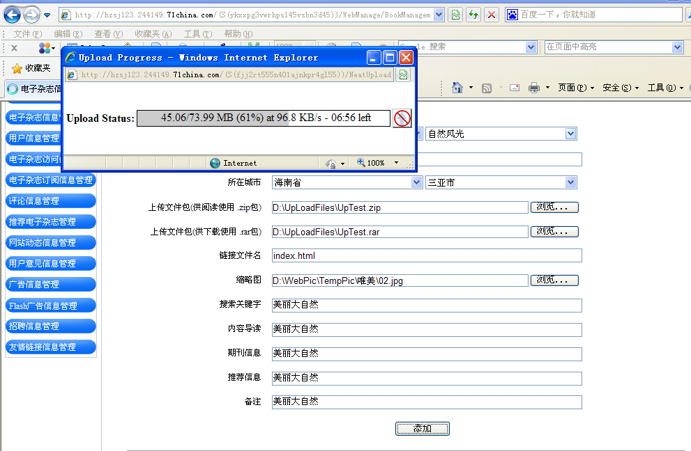 将压缩包中的Brettle.Web.NeatUpload.dll、Brettle.Web.NeatUpload.HashedInputFile.dll、Hitone.Web.SqlServerUploader.dll三个文件放到项目的Bin目录下(不确定这三个文件是否全都要用上,不管了,都用是没错的),然后对这三个文件添加引用.